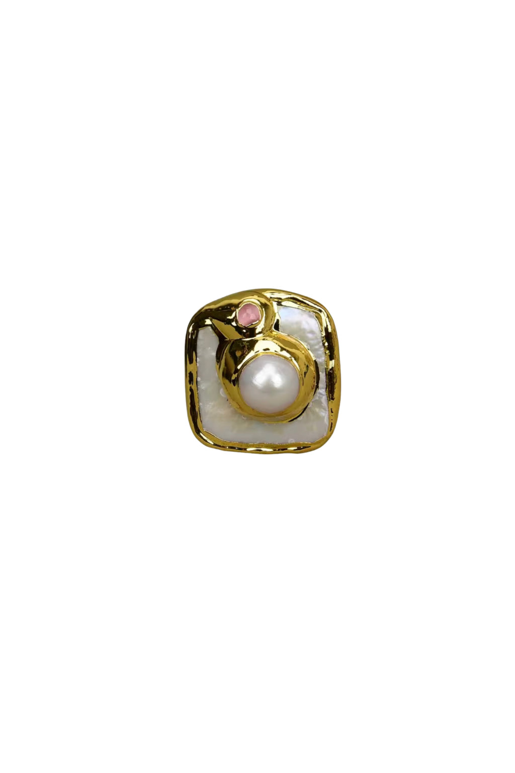 A modern heirloom with a playful twist, the Viola Ring combines the mystical depth of a faceted amethyst with the soft iridescence of a pink accent stone, all set upon a backdrop of lustrous mother-of-pearl. Framed in fluid gold-plated edges, this piece brings together contemporary design and timeless materials, making it a versatile addition to your everyday styling or a thoughtful gift for those who adore understated luxury.