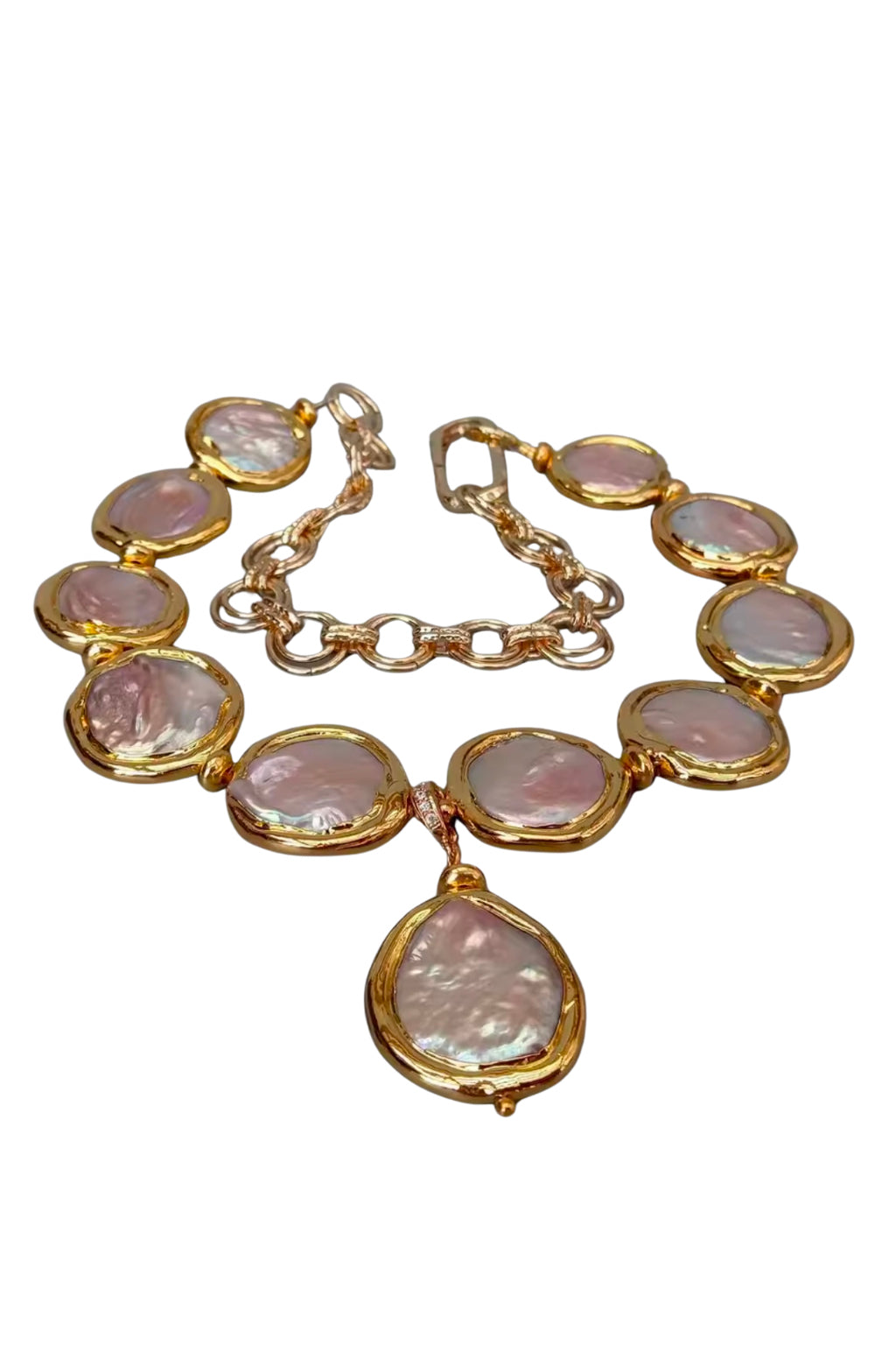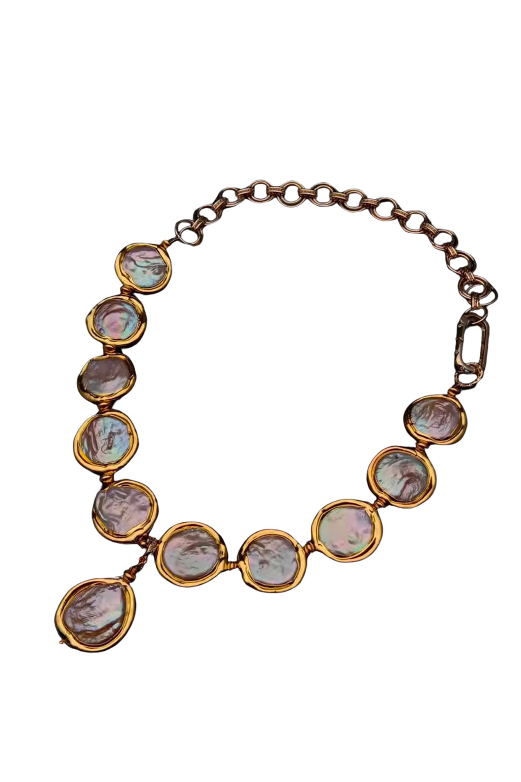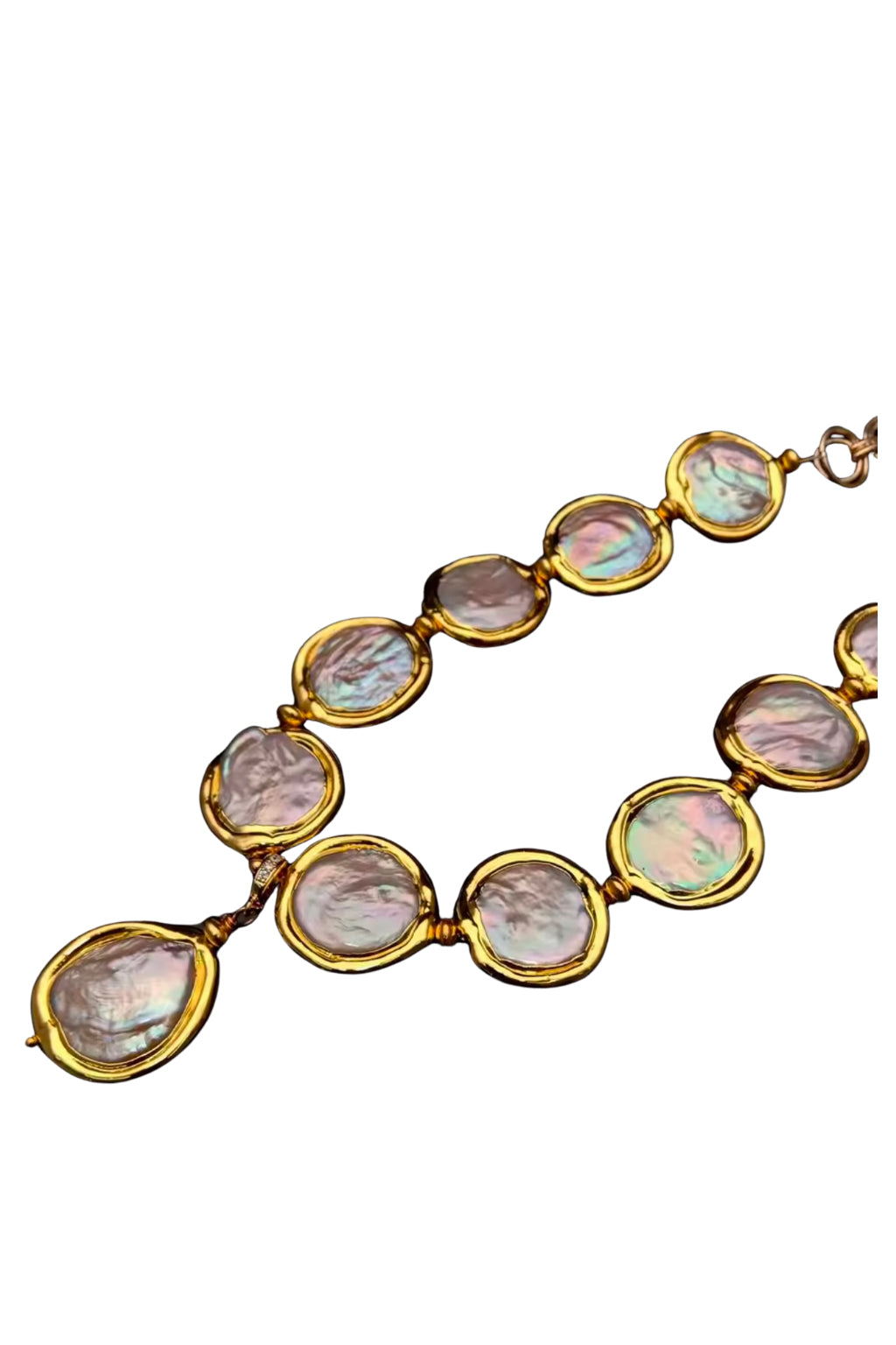 Make a statement with the Luna Tide Iridescent Pearl Collar, a stunning blend of organic beauty and contemporary design. Featuring a series of iridescent coin pearls each uniquely shaped and haloed in rich gold-toned bezels this necklace captures the serene movement of ocean tides under moonlight.