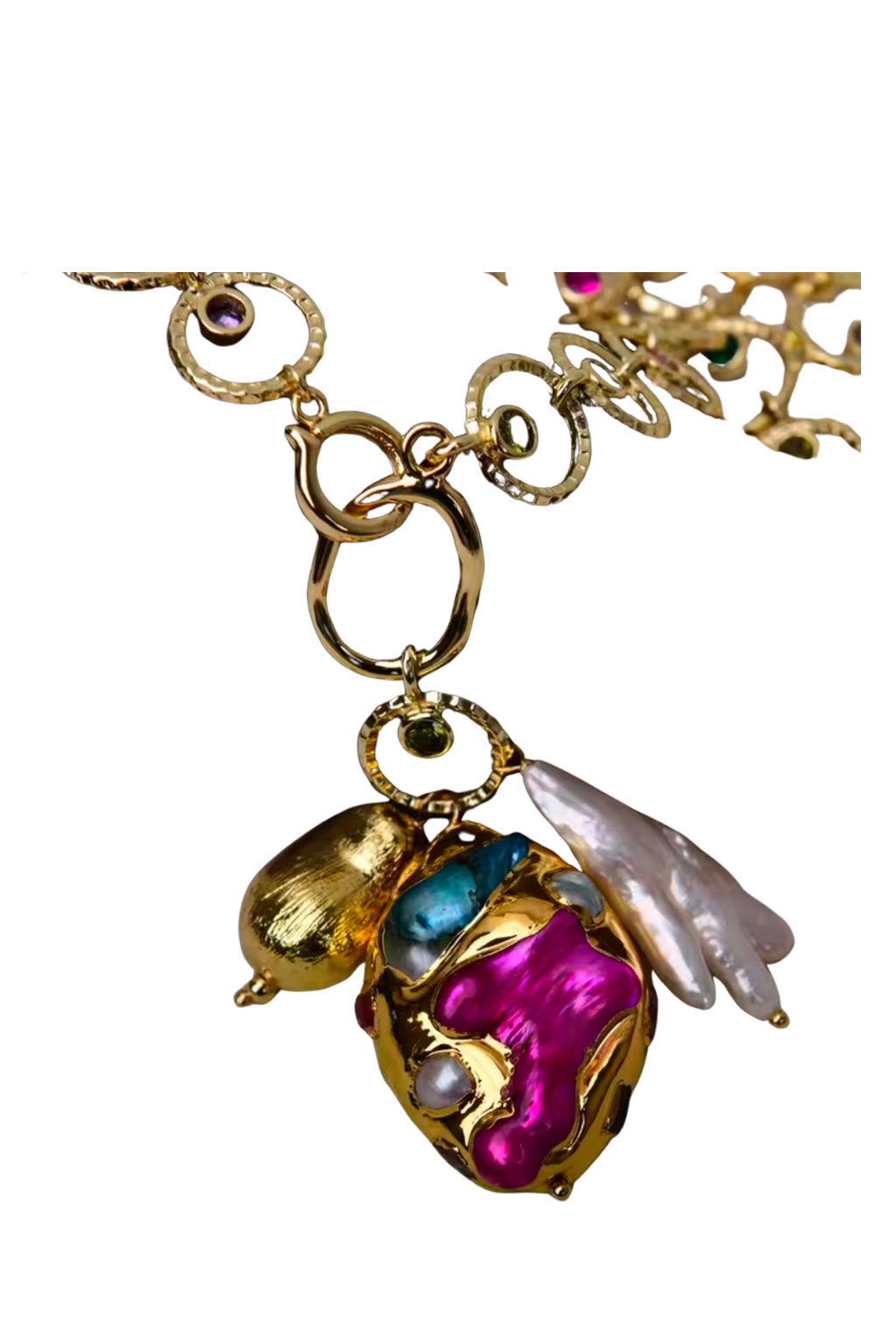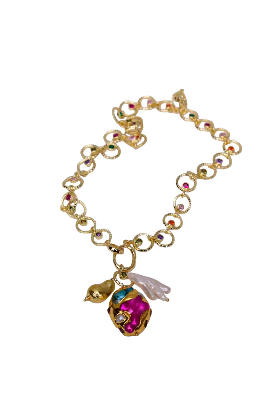 Elevate your jewellery collection with this exquisite gold bracelet, featuring a delicate looped chain adorned with subtle crystal accents for a refined sparkle. The piece is beautifully finished with a colourful charm, showcasing a vibrant, iridescent stone paired with a dainty gold bird and a soft pearl detail, bringing a touch of whimsy and elegance to your look. Perfect for layering or wearing alone, this bracelet adds a playful yet sophisticated statement to both everyday ensembles and special occasion styling.