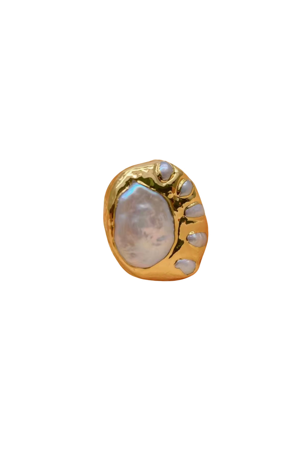 Channelling raw elegance, the Tidal Crest Ring features a large baroque pearl at its centre, framed by five smaller pearls that rise like waves from a molten golden shore. Evocative of sea foam and moonlight, this bold cocktail ring adds drama and dreaminess in equal measure.