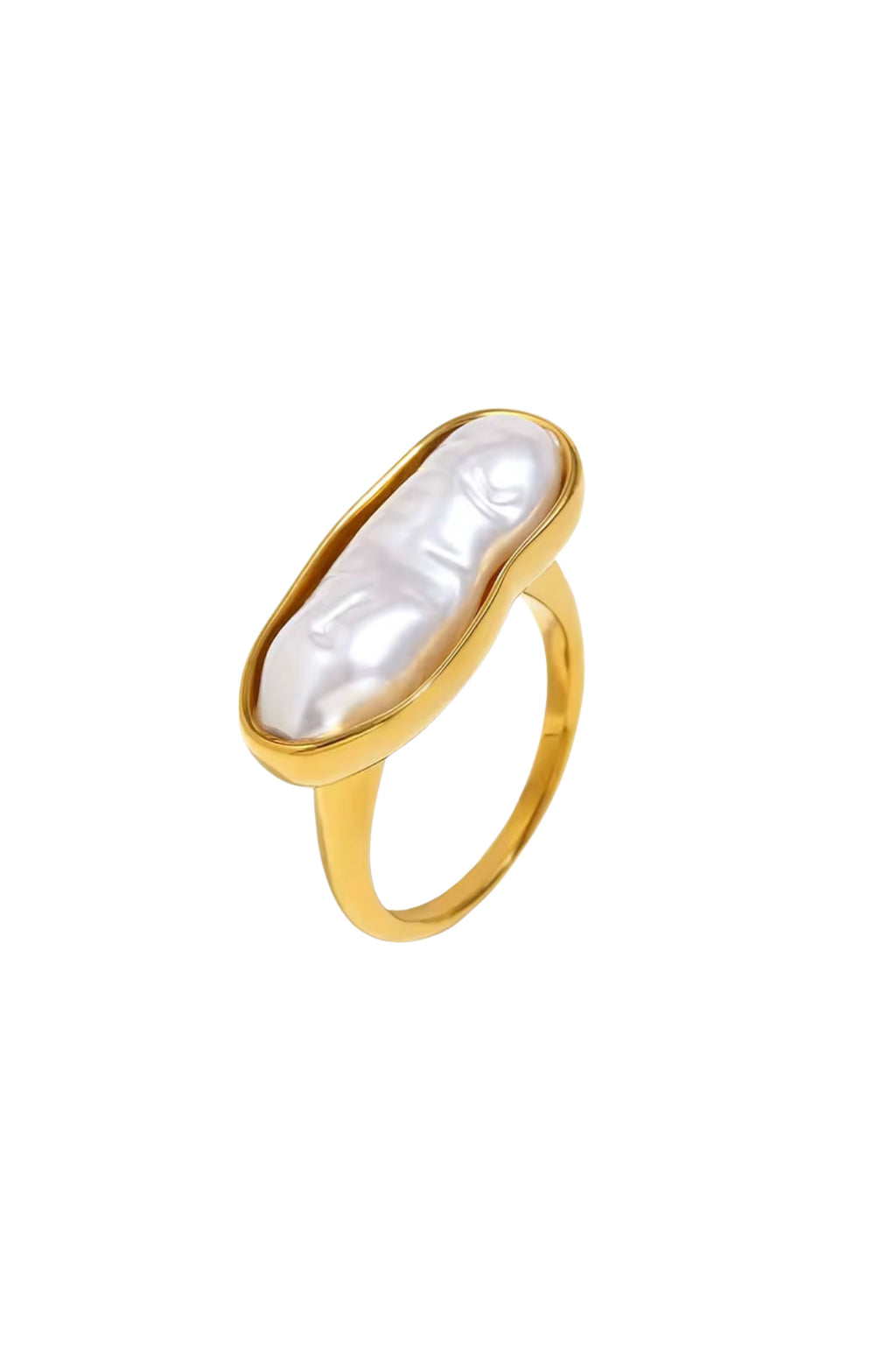 Elevate your everyday elegance with the Baroque Pearl Column Ring a modern ode to timeless sophistication. Handcrafted in high-polish gold-tone metal, this striking piece features a sculptural, elongated baroque pearl that captures the organic beauty of the sea.